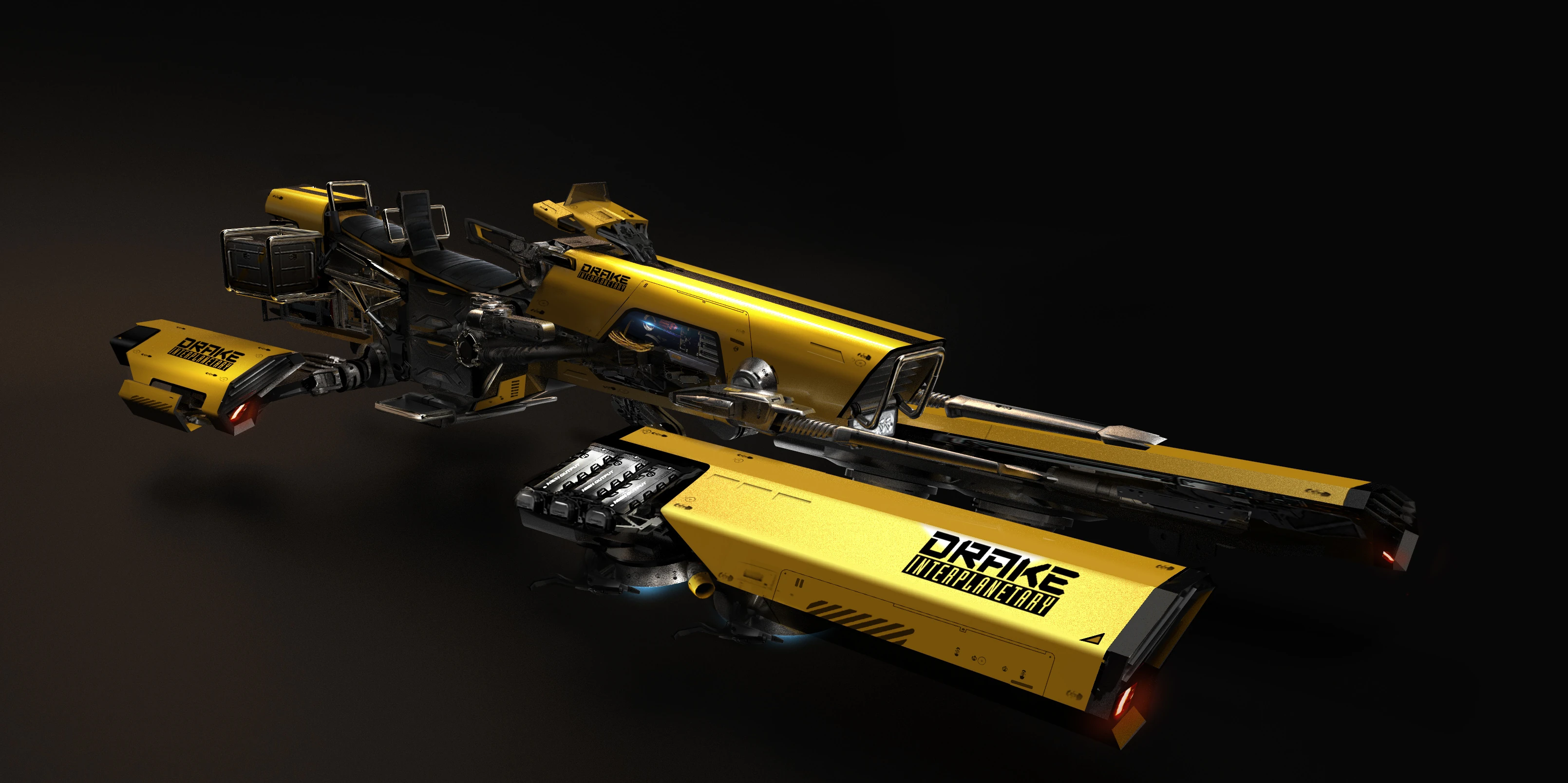 The Dragonfly Yellowjacket is a special edition of the Dragonfly Black, it is a two person grav-lev bike manufactured by Drake Interplanetary. It has a rear facing passenger seat and two ship guns. It can also fly in space, but it is unable to re-enter a planet in a controlled manner or to fly in the atmosphere. The Dragonfly Yellowjacket was only sold during the 2016 concept sale.[1]