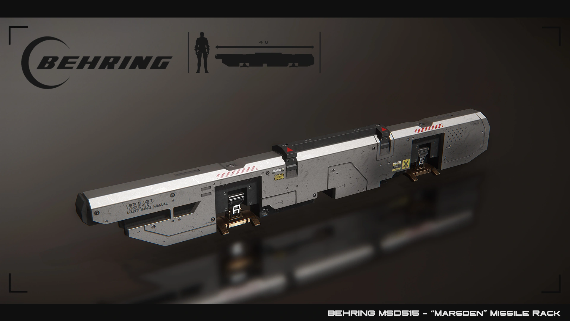 Behring's MSD-515 "Marsden" is a complete ordnance storage and deployment system that can be mounted on any compatible size 5 hardpoint for the reliable and effective launch of one S5 missile.